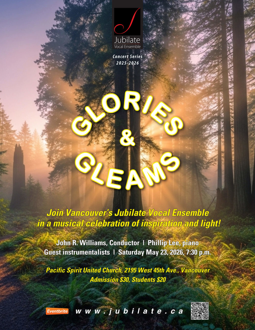What better way to celebrate a Saturday evening in late May than immersed in the soaring harmonies of light and hope? Vancouver’s Jubilate Vocal Ensemble is thrilled to present Glories & Gleams, a stirring collection of choral arrangements spanning a gamut of genres: from lively pop pieces by British balladeers Elton John, Ed Sheeran and young phenom Jacob Collier to Canadian and Scottish folk songs – and two pieces by choral superstar Eric Whitacre. The concert title is plucked from the poetry of Marjorie Pickthall’s After the Wind, which is hauntingly set to music by composer Nicholas Ryan Kelly. Compiled and directed by JVE Conductor John R. Williams, the free-ranging program is sure to engage the ears and hearts of music lovers of all ages and tastes.